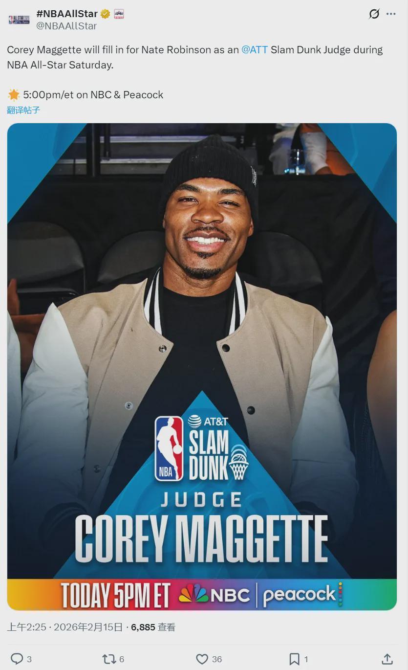 三届扣篮王麦克朗,缺席本届扣篮大赛。今年扣篮大赛评委:科里-马盖蒂、霍华德、多米尼克-威尔金斯、布伦特-巴里和J博士。此前NBA官方公布的评委名单有内特-罗宾逊,今天赛前临时换成了马盖蒂,不知道内特因何事退出。