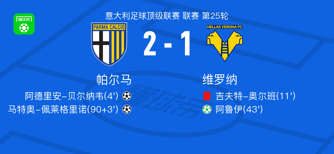 北京时间2月15日意大利足球顶级联赛第25轮,帕尔马主场对阵维罗纳。比赛中,帕尔马球员率先通过配合由阿德里安-贝尔纳韦打入一球;随后维罗纳球员吃到红牌,球队陷入被动;半场结束前,维罗纳依靠点球由阿鲁伊扳回一球;下半场补时阶段,帕尔马再次通过配合由马特奥-佩莱格里诺破门锁定胜局。最终比分帕尔马2-1维罗纳。